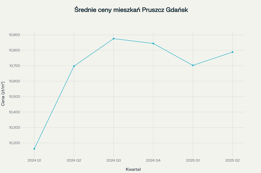 Rynek nieruchomości w Pruszczu Gdańskim w ostatnim roku charakteryzował się umiarkowanym wzrostem cen przy zachowaniu stabilności w porównaniu do większości miast województwa pomorskiego. Dane z portalu Adresowo.pl pokazują, że średnia cena mieszkań za metr kwadratowy wzrosła z 10 162 zł w pierwszym kwartale 2024 roku do 10 788 zł w drugim kwartale 2025 roku, co oznacza wzrost o 6,2% w skali roku.